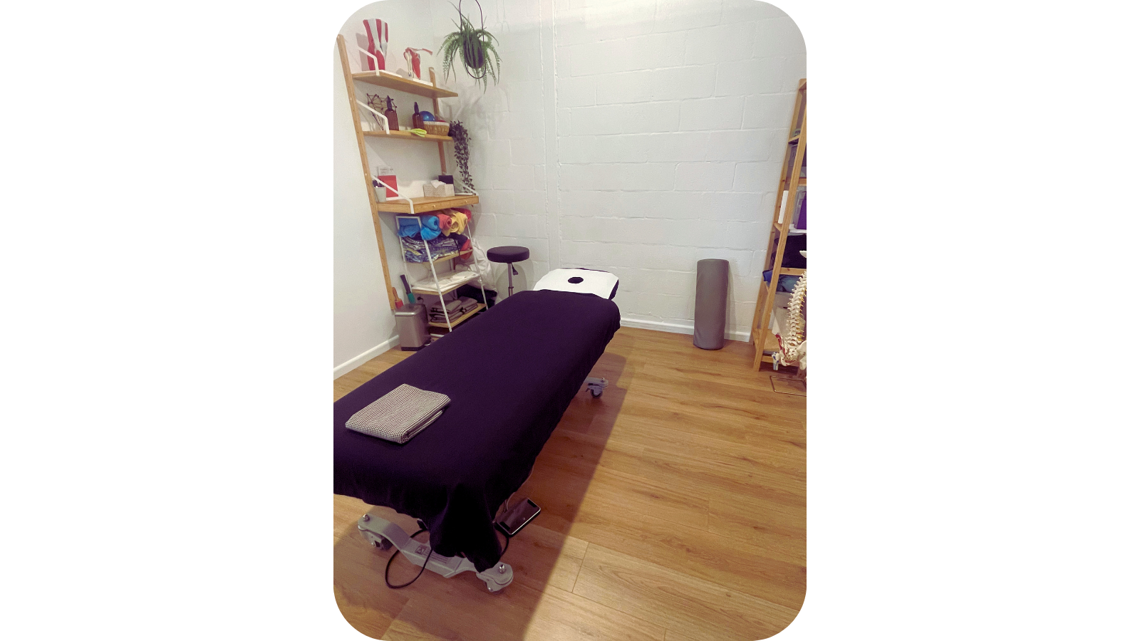 • Fully equipped treatment room (Athlegen table, desk, air conditioning/heating, dimmed lighting, practitioner stools and bolster)